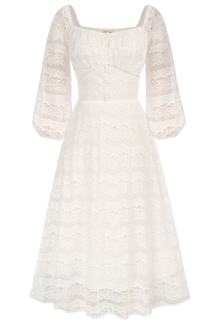 Defined Waist Lace Dress 3/4 Sleeve Square Neck Midi Dress