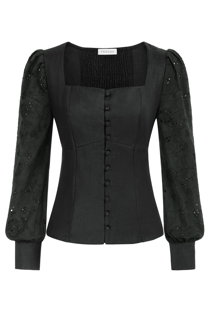 Contrast Fabric Shirt Long Sleeve Square Neck Linen Tops